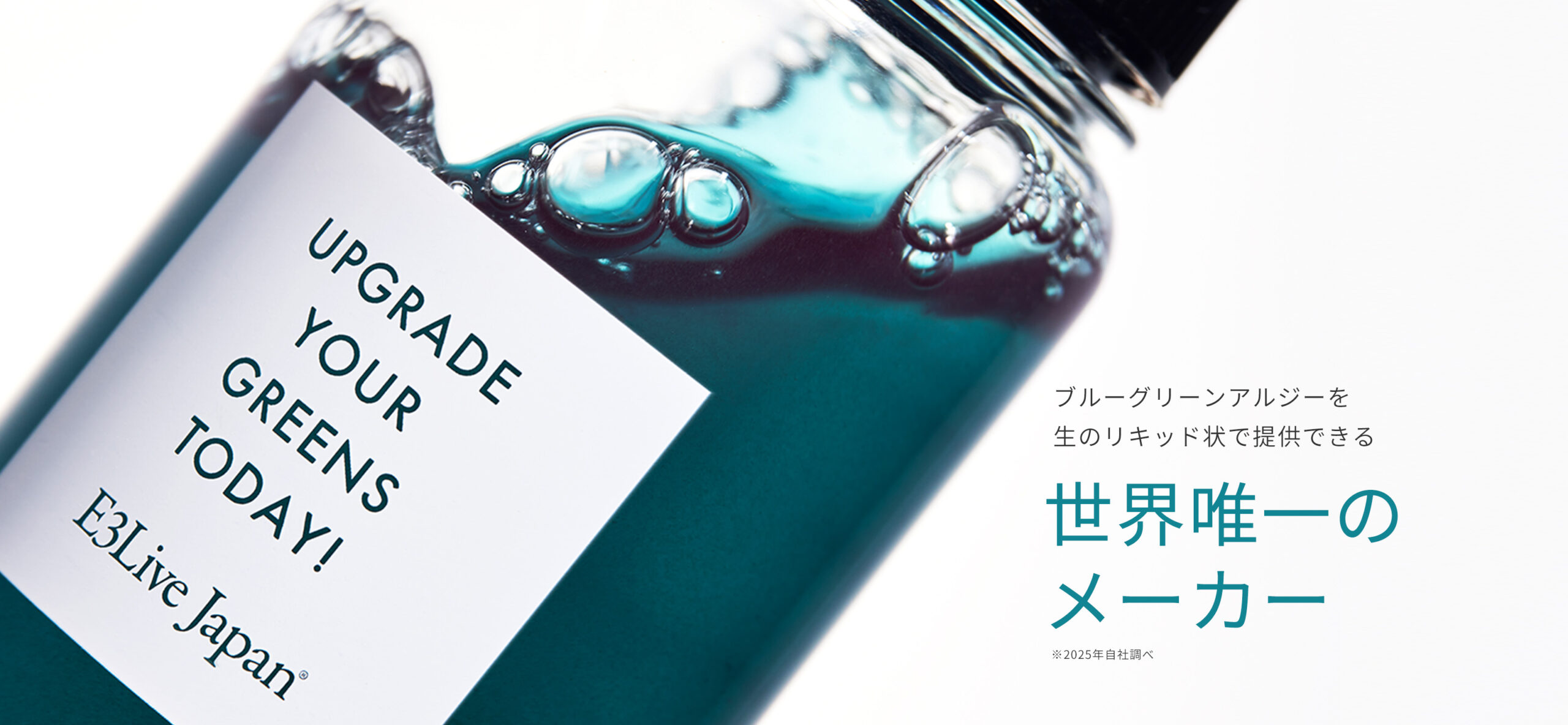わたしたちE3Live(イースリーライブ)は、AFAブルーグリーンアルジーを生のリキッド状で提供できる、世界で唯一のメーカーです。